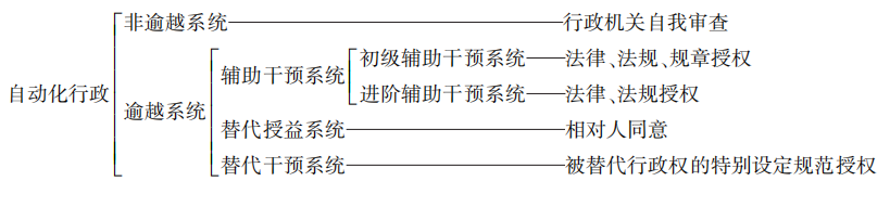逾越系统包括辅助干预系统、替代授益系统和替代干预系统。辅助干预系统在辅助行政机关作出决定的同时,对公民权益产生新的干预。以电子技术监控为代表的初级辅助干预系统,主要涉及个人信息的收集和处理,可依据《个人信息保护法》第26条的规定,经法律、行政法规、地方性法规、部门规章或地方政府规章等“国家有关规定”的授权即可引入。以“交管12123”APP为代表的进阶型辅助干预系统,除了收集和处理个人信息,还涉及对相对人程序性权利的减损,根据《立法法》第80条第2款第2句和第82条第6款的规定,需要获得法律、行政法规或地方性法规的授权才可引入,部门规章、地方政府规章均不得授权。替代授益系统运用于授益行政行为之中,代替了传统的人工操作,相对人可通过电子化形式提交申请和材料。替代授益系统减省了义务性程序,本质上是相对人是否愿意以个人信息置换程序性义务的减省,该系统以对个人信息的收集和处理为基础,根据《个人信息保护法》第13条的规定,经由相对人同意即可引入,无需另行授权。替代干预系统利用计算机技术、算法程序、深度学习或神经网络替代行政执法人员处理关键数据,自动生成对相对人具有干预效果的决策,代为技术性和专业性的裁量判断。替代干预系统完全脱离行政机关的控制,代替行政机关履行国家干预职责,经授权的行政权力被实质性架空,根据法律保留原则和我国《立法法》及“行政三法”,需由被替代行政权的特别设定规范重新进行或明确或概括地授权,方能消除组织法与行为法上的疑虑,但也应慎重。(如下图)