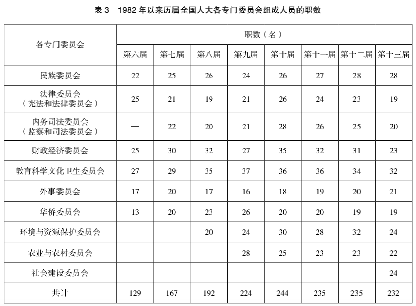 从表3可以看出1982年以来历届全国人大专门委员会组成人员的职数和发展变化情况: