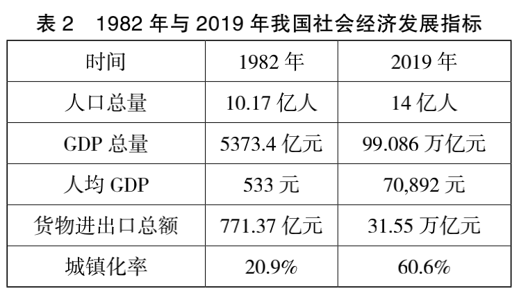当然,我国整体上是发展中国家,尤其是国家治理体系和治理能力现代化水平与宪法确定的把我国建设成为富强民主文明和谐美丽的社会主义现代化强国、实现中华民族伟大复兴的目标还有相当大的差距。2019年我国国民经济社会发展情况与1982年相比,也有巨大变化(见表2)。此外,普通高校招生人数1978年到1988年平均每年招收45万人,2009年到2019年平均每年招收732万人。