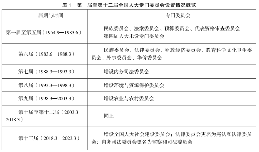 1954年《宪法》第34条规定:“全国人民代表大会设立民族委员会、法案委员会、预算委员会、代表资格审查委员会和其他需要设立的委员会。”1978年《宪法》第27条规定:“全国人民代表大会和全国人民代表大会常务委员会可以根据需要设立若干专门委员会。”