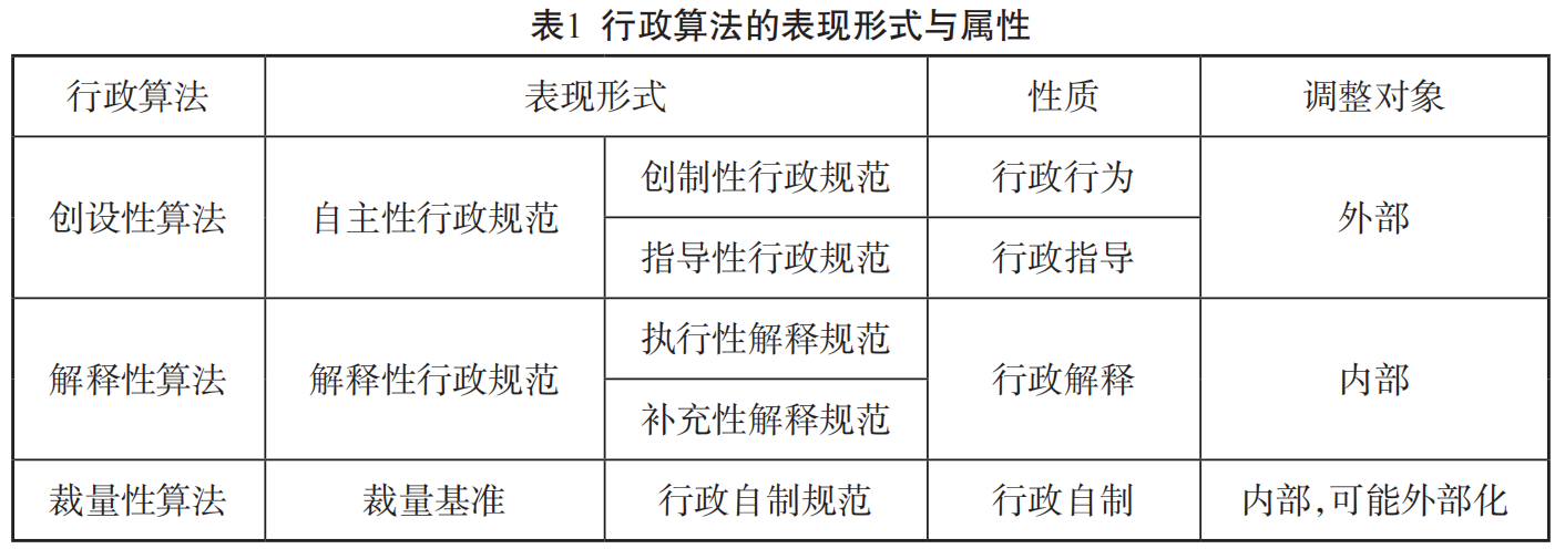 具体来说,创设性算法属于自主性行政规范,是行政机关为了行政管理的实际需要所自主制定的算法规则。依法律效果的不同,其可以分为创制性行政规范和指导性行政规范。解释性算法属于解释性行政规范,是为了适用法律、统一认知,对法律、法规、规章以及其他规范性文件进行解释而形成的算法。依制定目的的不同,其可以分为执行性解释规范和补充性解释规范。因为解释性规范没有独立设定权利义务,故而不能构成一个独立的外部行政行为。裁量性算法属于裁量基准,属于行政自制规范,是行政惯例和法律原则的载体,目的在于对裁量权的正当行使形成一种法定的自我约束。(见表1)