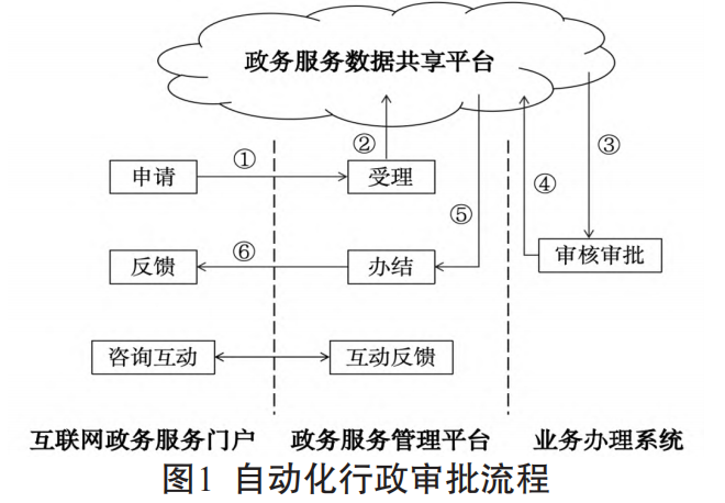 自动化行政改变了以往的行政法治范式。它通过互联网、大数据、云计算等技术手段,搭建起自动化平台系统,由算法引导数据实现自动传递、互联互通,使得大量原本需要人工完成的信息收集、分析、处理工作实现了自动化运行。由此可见,自动化行政目的的实现,需要一系列连续作出的步骤或行为来达成。以自动化行政审批为例,该业务办理可以简单分解为申请、受理、办理、办结、反馈等步骤,全过程依托政务服务数据共享平台支撑,业务数据在互联网政务服务门户、政务服务管理平台、业务办理系统之间流转,自动完成信息的收集、分析与处理。具体自动化流程如图1所示。