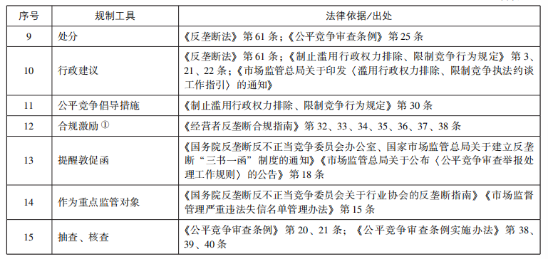 基于前述反垄断法律体系,笔者梳理出15种主要监管工具(见表1),包含:公平竞争审查、经营者集中分级分类审查、宽大制度、经营者承诺、反垄断执法约谈、行政处罚、提请社会团体登记管理机关依法撤销登记、处分、行政建议、公平竞争倡导措施、合规激励、提醒敦促函、作为重点监管对象、核查和抽查。