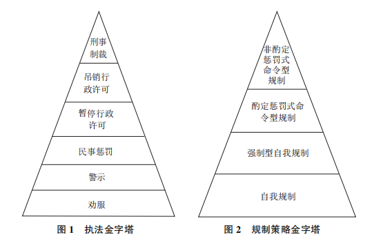超越以往单一的命令—控制型规制模式,回应性规制理论强调规制主体的多元化、规制策略和规制手段的多样性,建构起不同规制主体综合运用柔性执法方式和刚性执法方式的混合监管机制。学理上,回应性规制理论主要是以治理术理论(Governmentality)、法律的自创生理论(Autopoiesis)以及回应性法理论(Responsive Law Theory)为理论基础。内容上,回应性规制理论强调规制主体除了政府以外,还包括社会团体等非政府机构,甚至企业本身;规制策略不仅包含命令型规制,也包含自我规制;规制手段不仅有劝服、警示和民事惩罚,还包括刑事惩罚和行政处罚。一方面,政府在规制策略和手段的使用上应当具有“回应性”;另一方面,为达到最有效的结果,应当优先使用强制力最弱、最具协商色彩的劝导机制,而后才能拾级而上。